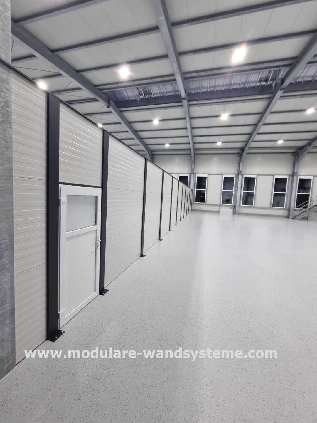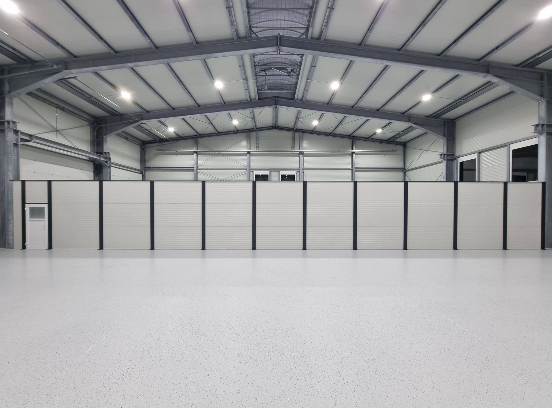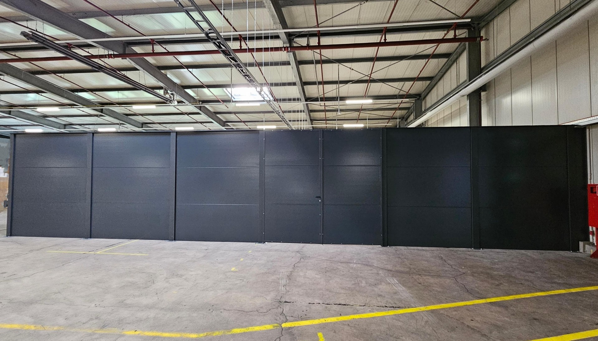 Das Modularen Wandsystem ist in diesem Fall, mit Sandwichpaneelen als Hallen-Abtrennung in einer Industriehalle aufgebaut worden.